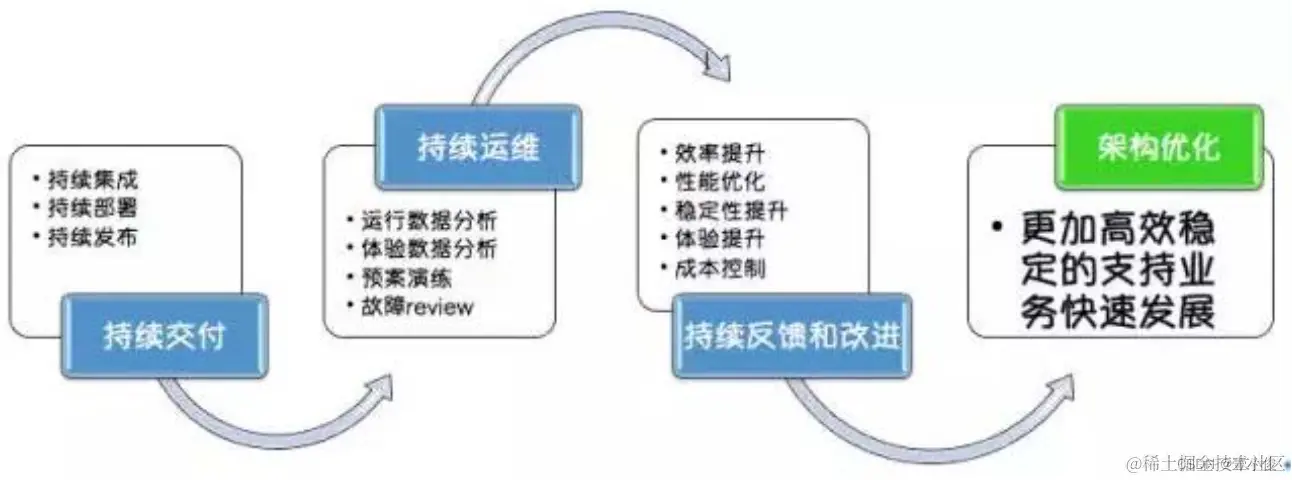 这张图的思路应该非常清晰了,而且对照一下我们日常在做的工作,基本上也离不开图中所描述的这些事情。 这里我想表达的是,我们应该从这张图中敏锐地观察到,研发团队对运维团队的诉求,以及运维呈现的价值已经发生了变化,我们更加需要能够帮助团队建设出高效运维体系的角色,而不是能够被动响应更多问题的角色。