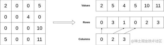 在稀疏矩阵中,我们可以使用三个不同的数组来存储行索引、列偏移、和其中的值,而不是直接在二维矩阵中存储值。以这种方式按列压缩稀疏矩阵