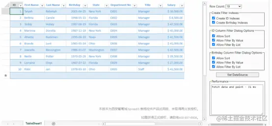 由于底层采用了稀疏矩阵来优化存储,SpreadJS在前端页面中,实现了100W级别数据秒级响应的能力: