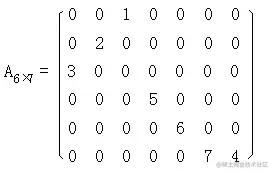 一般来说,在矩阵中,若数值为0的元素数目远远多于非0元素的数目,并且非0元素分布没有规律时,则称该矩阵为稀疏矩阵;与之相反,若非0元素数目占大多数时,则称该矩阵为稠密矩阵。定义非零元素的总数比上矩阵所有元素的总数为矩阵的稠密度。,下面的矩阵就是一个典型的稀疏矩阵。