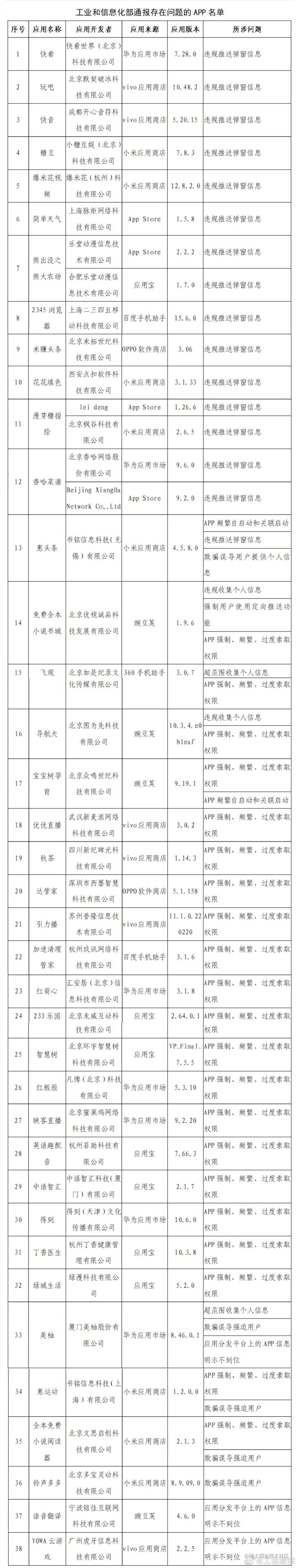 10 月 13 日消息,为巩固治理成效,营造共同维护消费者权益的良好环境,近期工信部开展 App 侵害用户权益整治“回头看”,组织第三方检测机构对信息弹窗违规推送、App 过度索取权限等问题进行重点抽测,共发现 38 款 App 存在问题,现予以公示。