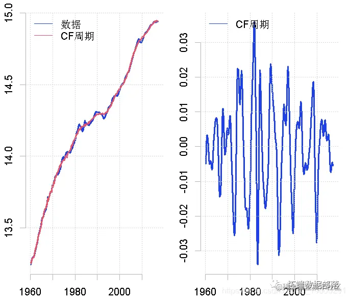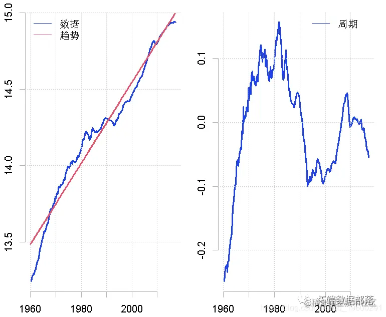然后我们可以借助下面的命令来绘制这个结果,其中趋势和周期被绘制在不同的数字上。