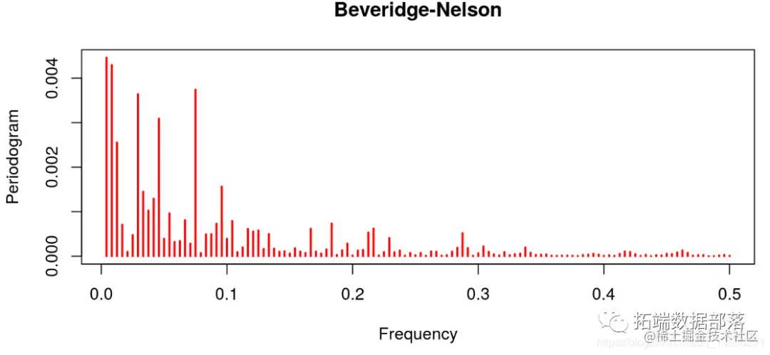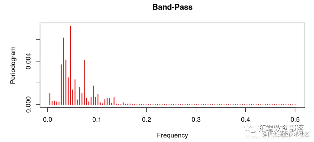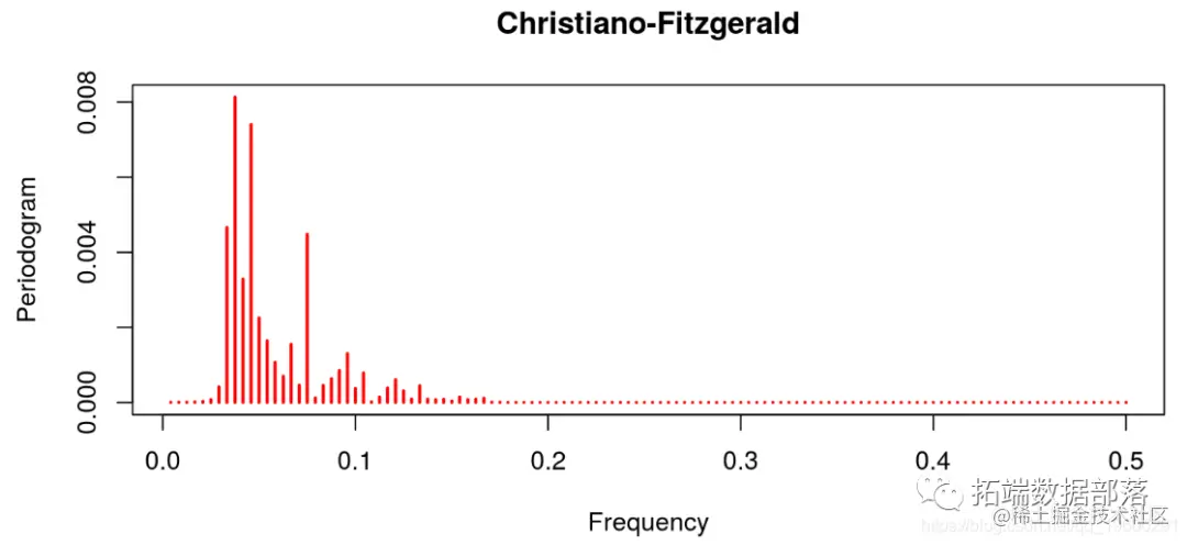 当然,我们可以利用一个过滤器,从总体时间序列变量中去除一些不需要的成分。为此,我们可以应用上下限相对较窄的Christiano-Fitzgerald滤波器。此后,我们使用应用于与周期有关的信息的周期图,来调查它是否成功地剔除了一些频率成分。