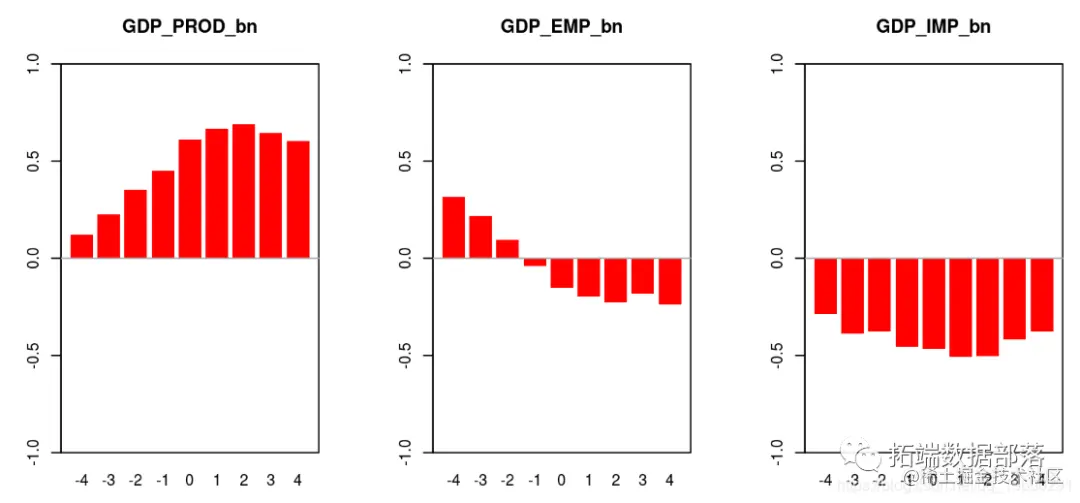 为了确定周期的特征是否合适,我们可以考虑宏观经济总量的一些不同周期性方法之间的相关性。例如,我们可以考虑产出和生产(或就业)的周期性在不同的滞后期应该是相关的。如果它们不相关,那么该方法可能无法准确描述各自变量的周期性成分。