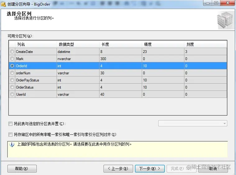 我这里选用orderid int类型 --- >> 下一步 --- >>