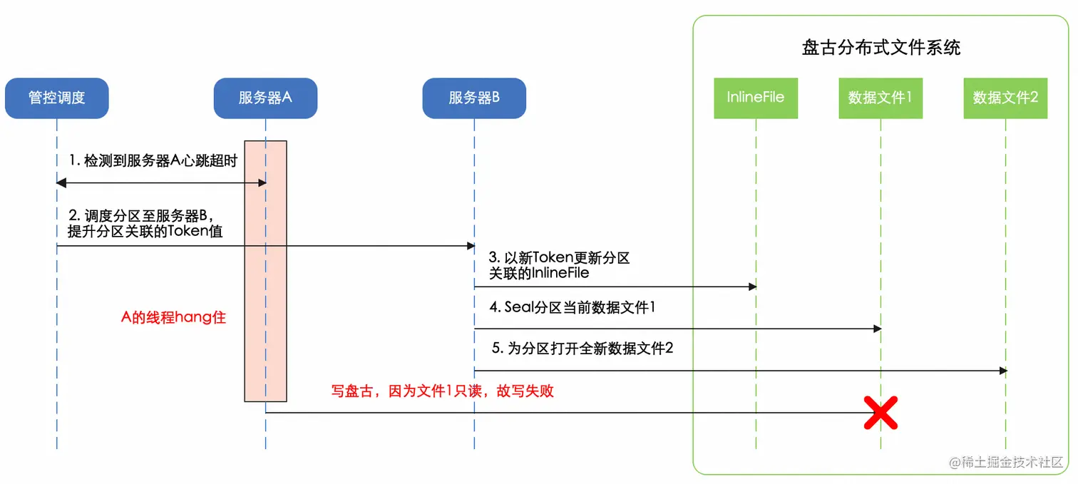 分布式锁提供 Fencing 保护的核心点是在访问共享资源的时候带上 Token 检查。盘古作为存储的统一的基座,通过引入特殊的 InlineFile 文件类型,配合 SealFile 操作,实现了类似的 IO Fence 保护能力:a)SealFile 操作用来关闭已经打开的文件,防止分布式锁旧的占有者继续写数据;b)为每个分区引入 InlineFile,针对盘古文件的元数据操作关联 InlineFile 相关的 CAS 判断,进而可以防止分布式锁旧的占有者打开新的文件。如图 11 所示,这两块功能结合起来事实上也是提供了存储系统中的写数据 Token 检查支持。