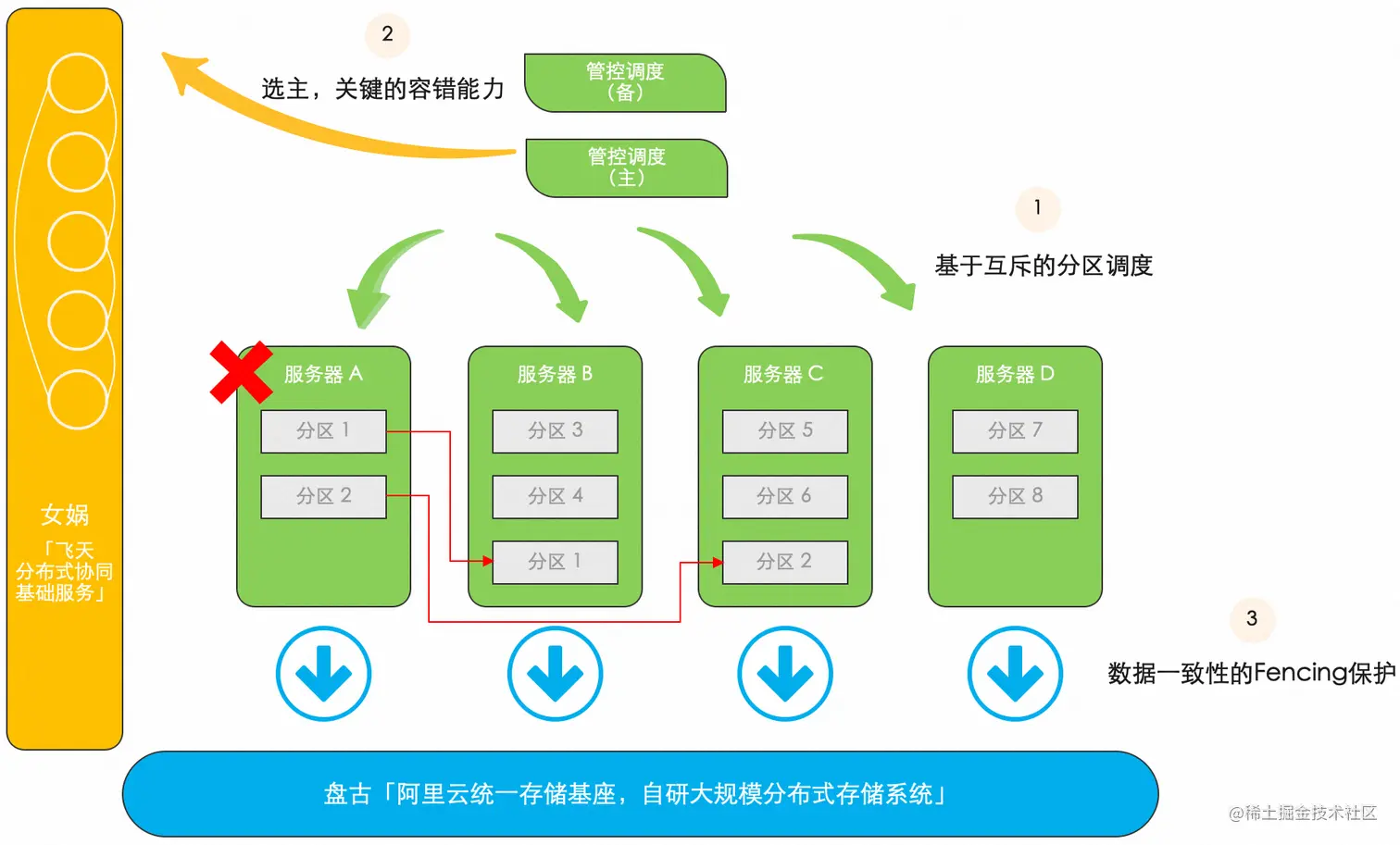 在云存储的分区调度模型中,有关分区资源的互斥访问(即任何时刻任一个分区必须至多为某一台服务器所加载并提供读写访问服务)是存储系统提供数据一致性的基石,必须得到保障。事实上,云存储的最佳实践中有着类似 DLM 的设计哲学,将分布式锁管理器的容错问题抽离出来,借助女娲-飞天分布式协同基础服务提供的选主功能来实现,进而可以专注在分布式锁资源的调度策略: