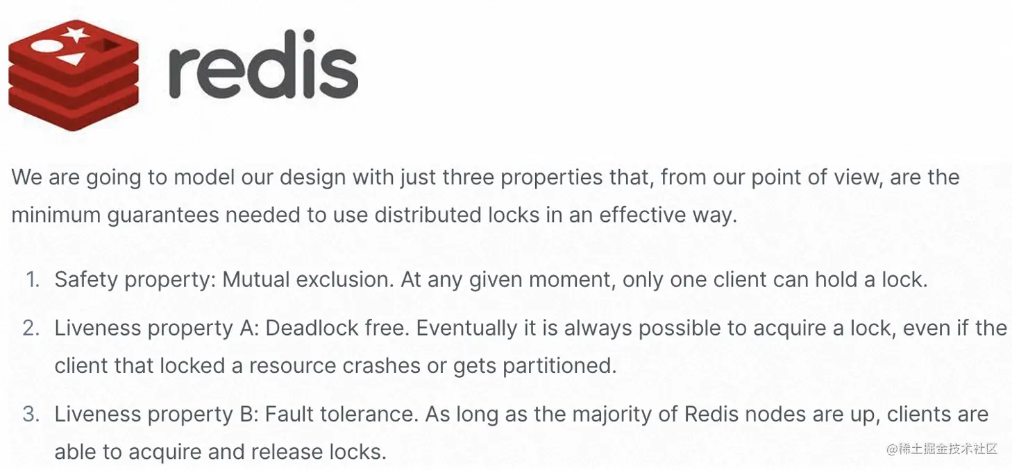 我们再看另一个大名鼎鼎的 Redis 对分布式锁性质的定义,它提出了分布式锁模型必须要遵守的三个原则:a)绝对互斥,同一时刻,只有一个客户端能够持有分布式锁;b)最终可用,如果持有分布式锁的客户端意外退出了,那么相关的分布式锁资源要能够被重新再分配;c)服务容错,提供分布式锁的服务本身要具备容错能力,即使部分节点崩溃,也不影响整体的分布式锁服务。