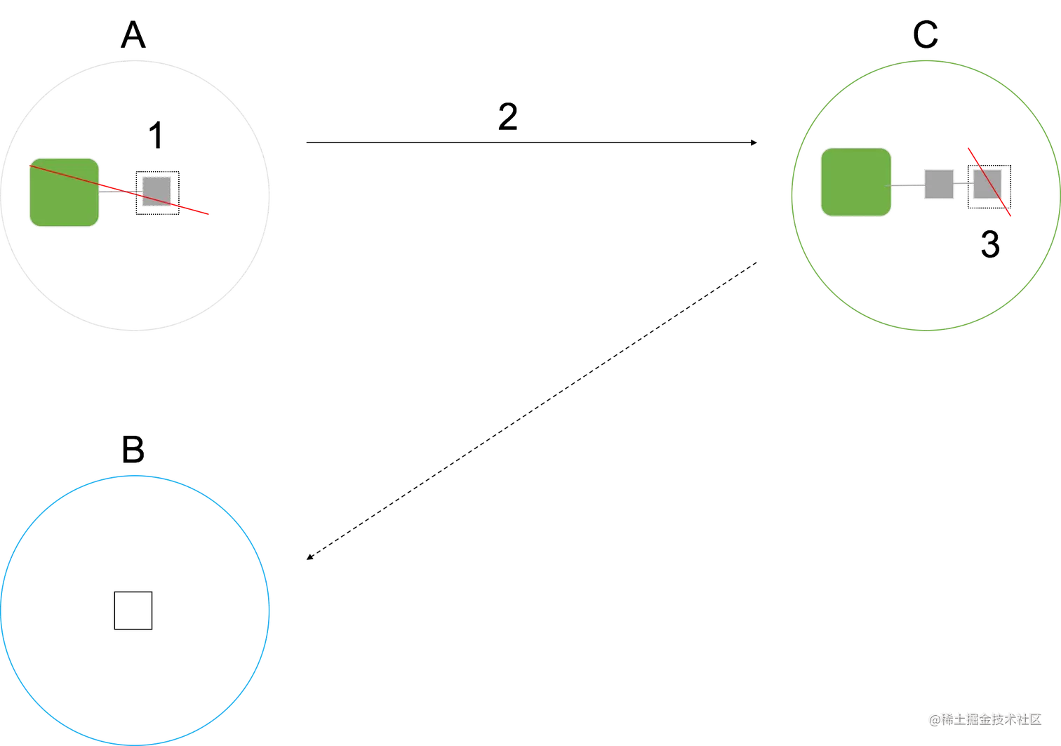 1. 节点 A 对资源 R1 解锁,删除本地构造该锁对象; 2. 节点 A 请求节点 C,请求将 A 的锁释放; 3. 若 A 是队列中最后一个请求者,则节点 C 将发送请求给 B,将 R1 从目录中摘除,以便后续其他节点能够成为锁的 Master ,否则,C 节点仅仅将 A 从 R1 的加锁队列移除。