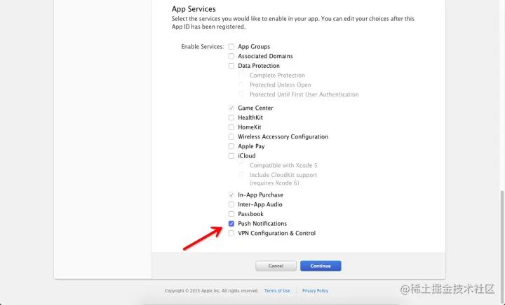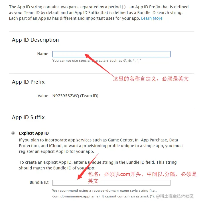 说明:APPid也叫包名,APPid必须是唯一的,不能包含特殊符号。填写AppID名称, 输入AppID Deion Name,用来描述您的AppID。(注意,必须输入英文),下方App ID Suffix输 入Bundle ID:这是您AppID的后缀,这个需要仔细命名,因为这个内容和您的程序直接相关,很多地方都需要用到,最好是com.yourcompany.yourappname的格式。当然对于没有公司名的个人开发者,也可以用您自己的英文名字或者拼音。