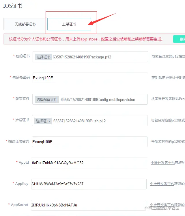 填写好之前申请的苹果证书、配置文件、推送证书,证书密码,个推的四个参数,保存即可。