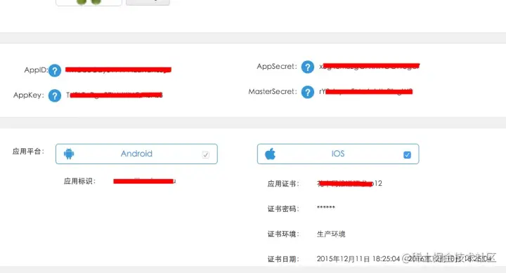 4、登记成功后,进入应用列表,点击右边的“应用配置”,就可以看到 APPID、AppSecret/Appkey/MasterSecret 四个参数了。