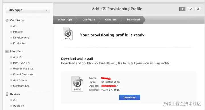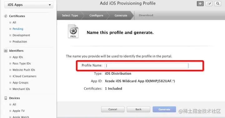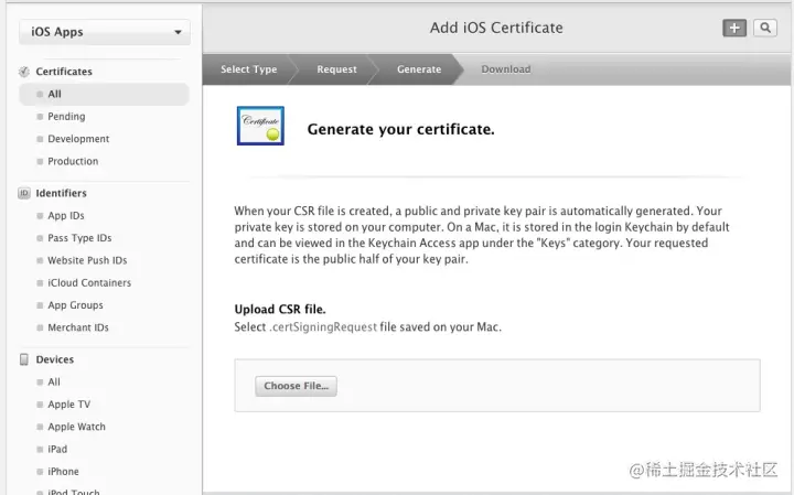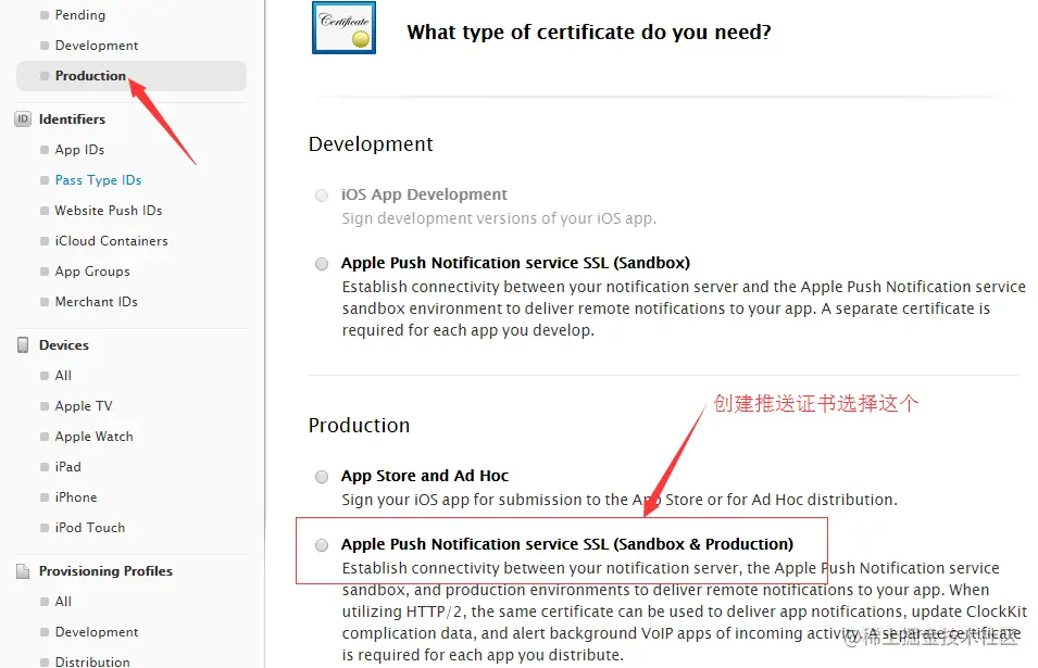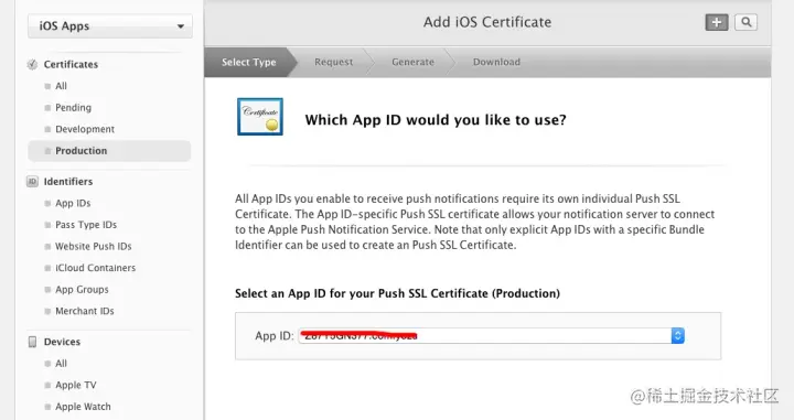 说明:因为这次需要的是发布app,所以证书需要选择的是Production版本,而开发测试的话是Development版本。