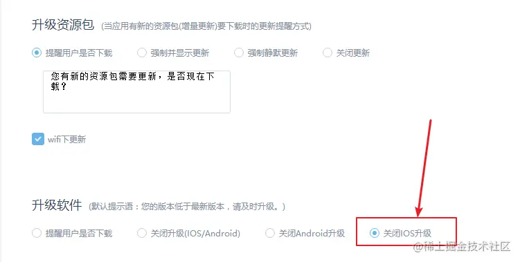 由于苹果公司禁止APP自带升级功能,所以必须关闭,否则上架不通过,安卓不影响。