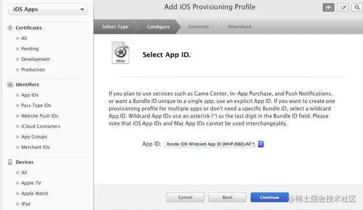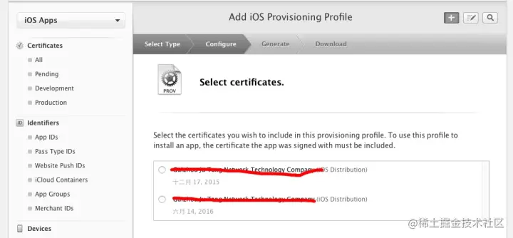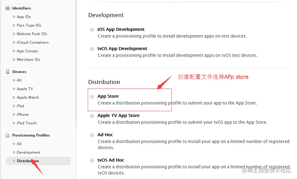 这里选择的类型是Production下的,然后选择 App Store and Ad Hoc.