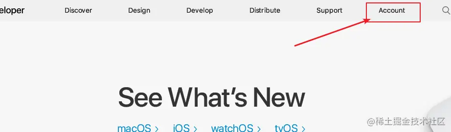 1、打开苹果开发者中心网站:developer.apple.com,点击右上角 Account 使用开发者账号登录,如下图所示: