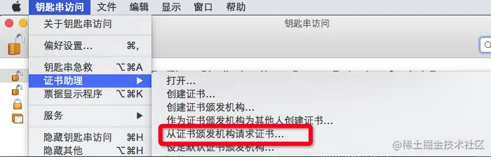 1、打开“应用程序”–>“实用工具”–>“钥匙串访问”–>“证书助理”中选择“从证书颁发机构请求证书”,如下图:
