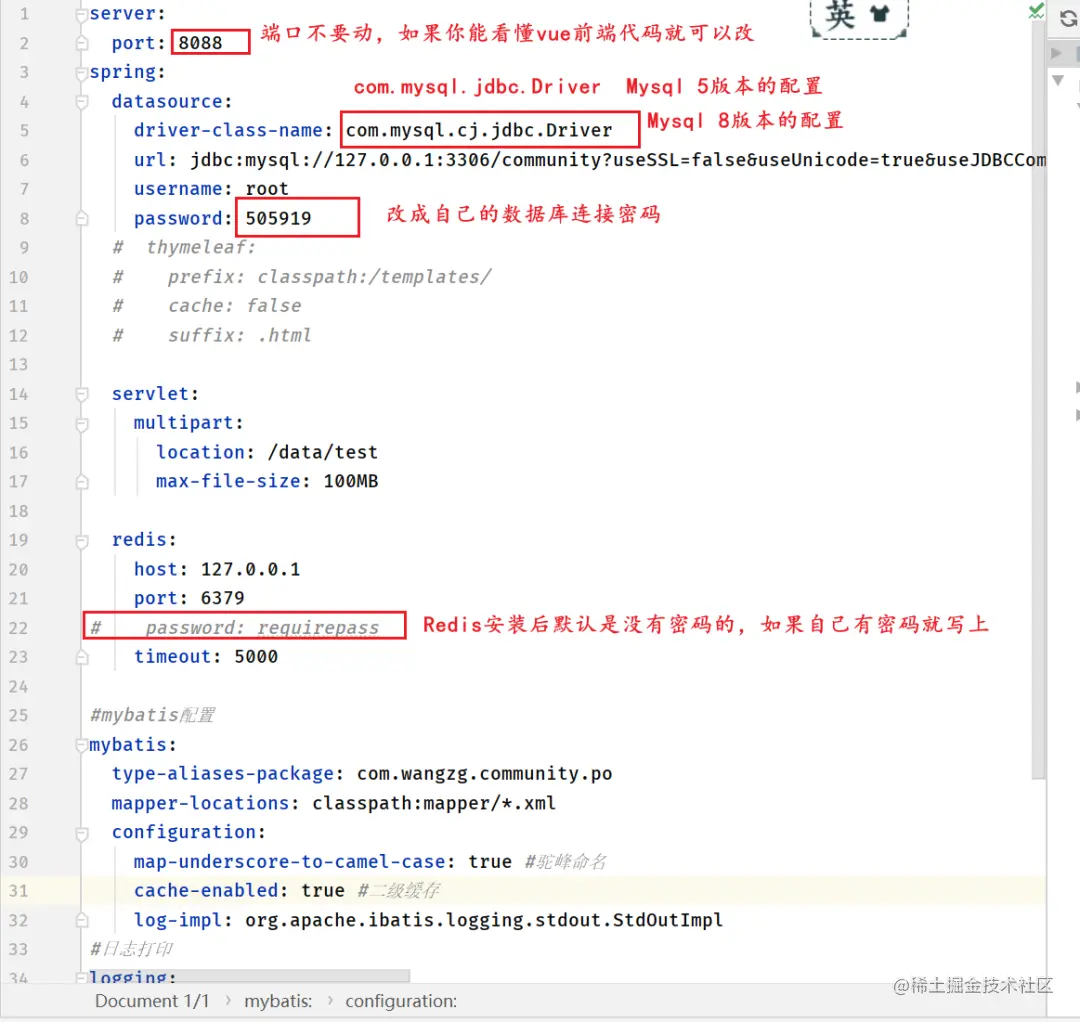 修改配置文件(application.yml)(如连接路径、用户名、密码等),这里给大家写好了一些注意事项,新手一定要看