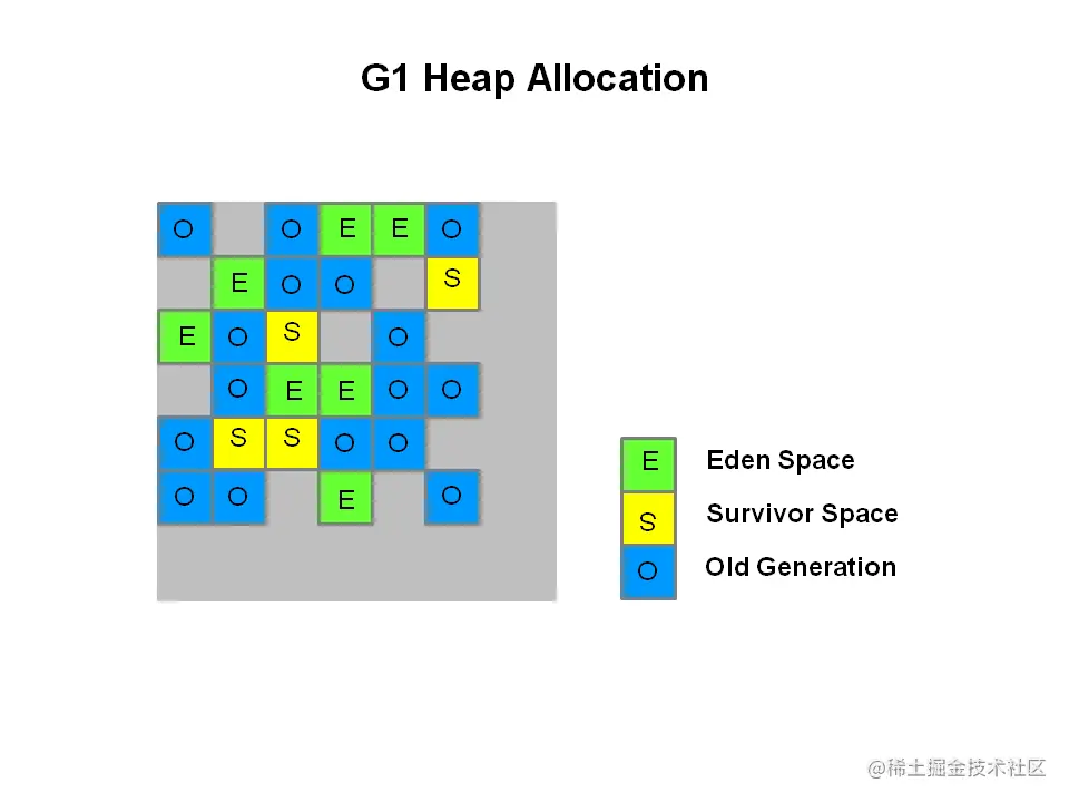 整个堆被分为将近 2000 个区域。最小的 1M,最大的 32 M。蓝色区域持有老年代对象,绿色区域持有年轻代对象。