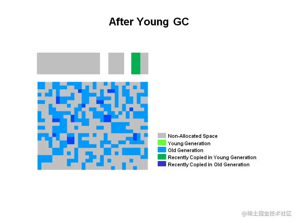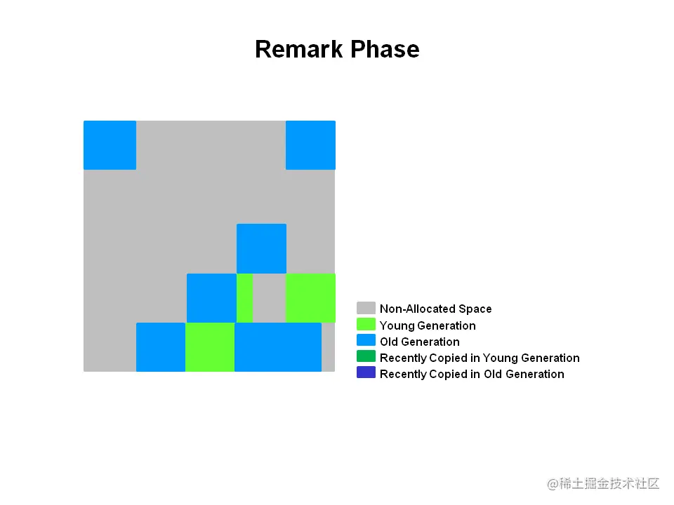 新提升到老年代的对象在图中显示为深蓝色。绿色的对象是还没有提升到老年代的年轻代对象。