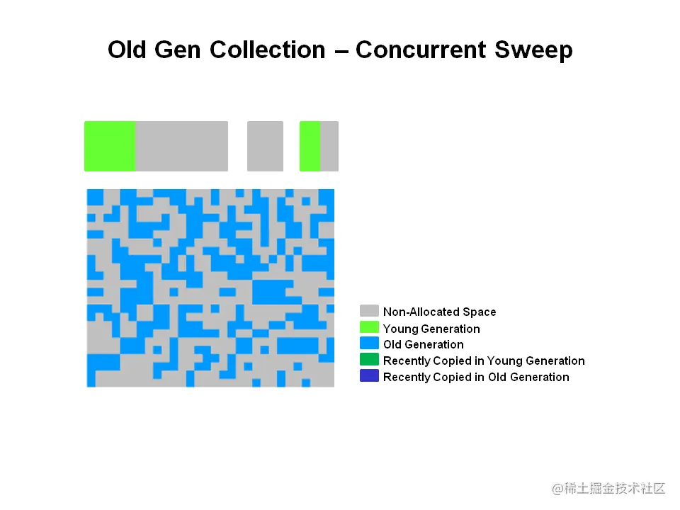 年轻代被标记为绿色,老年代标记为蓝色。下图可能就是应用程序已经运行一段时间之后 CMS 内的样子。对象分散在老代区域周围。