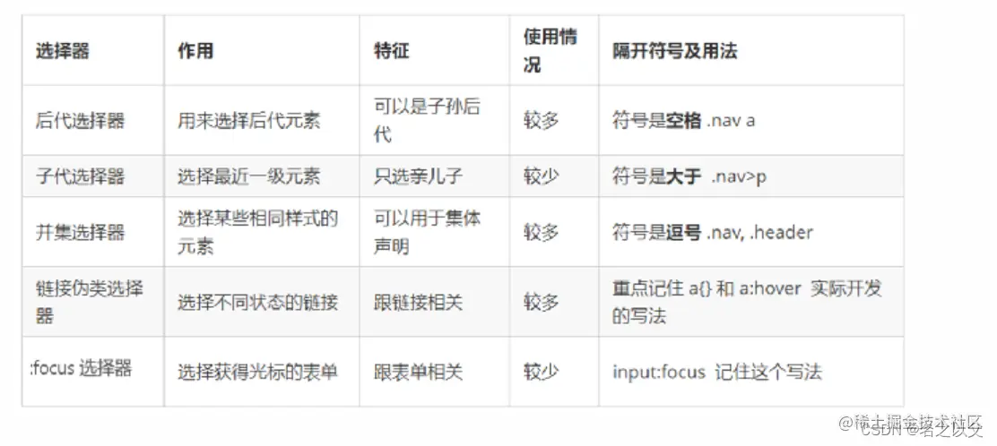 - 在后代选择器中,多个元素之间是用空格隔开的,