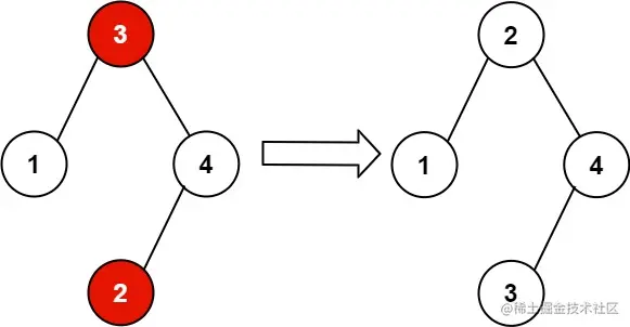 给你二叉搜索树的根节点 root ,该树中的 恰好 两个节点的值被错误地交换。请在不改变其结构的情况下,恢复这棵树 。