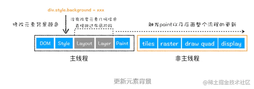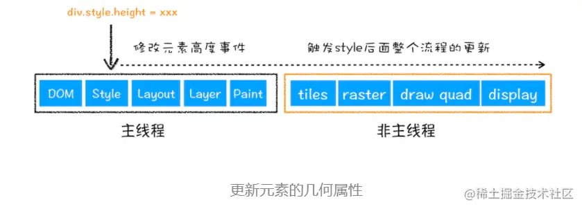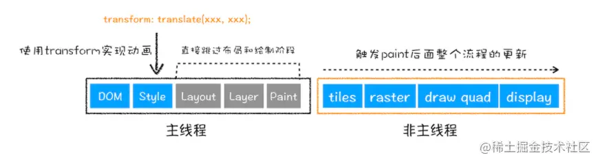 更改一个既不要布局也不要绘制的属性,渲染引擎将跳过布局和绘制,只执行后续的合成操作,这个过程叫做合成。例如transform