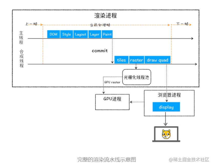 过程:浏览器进程中有一个叫 viz 的组件,接收 DrawQuad 命令后,将其页面内容绘制到内存中,最后再将内存显示在屏幕上。