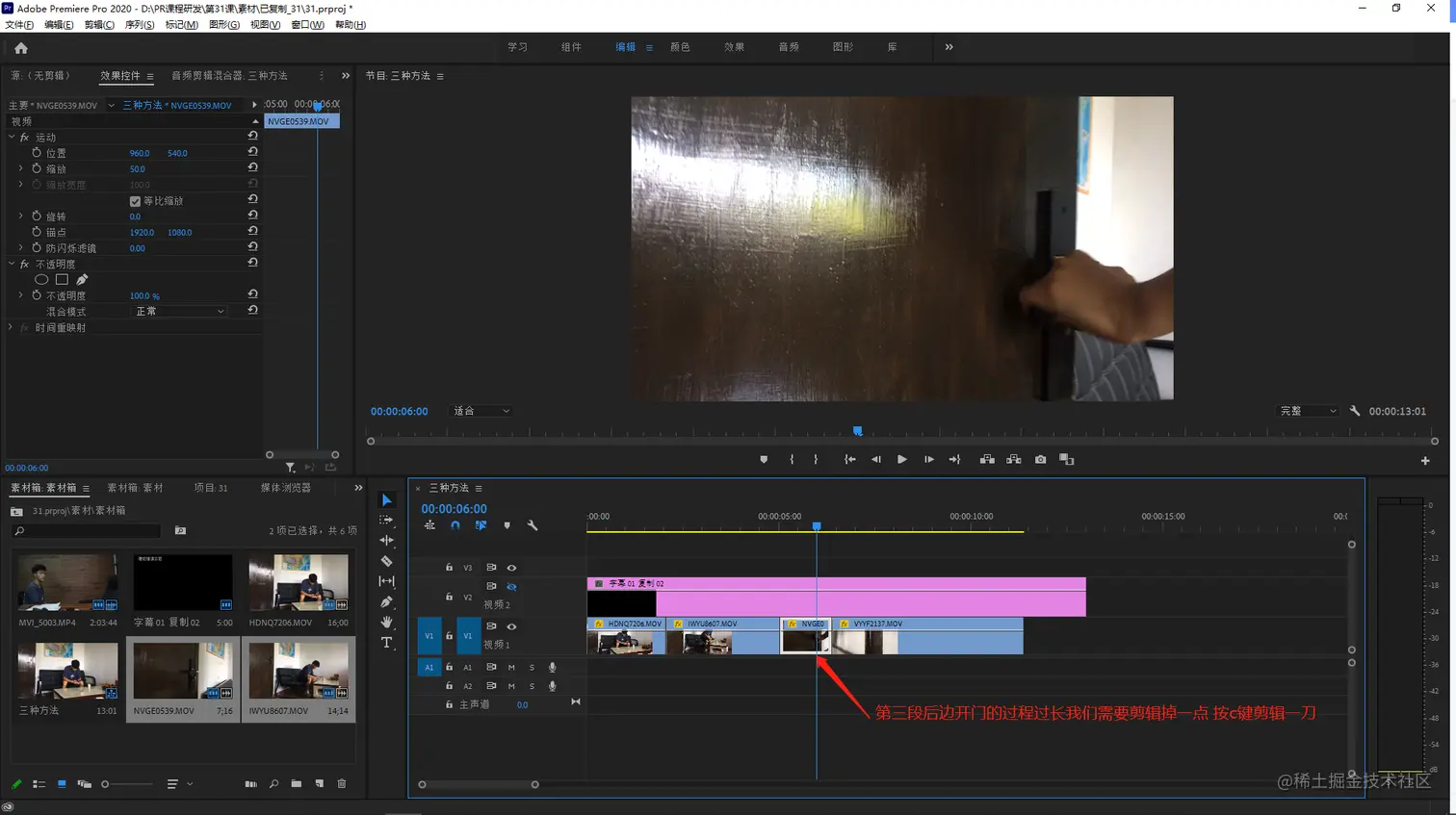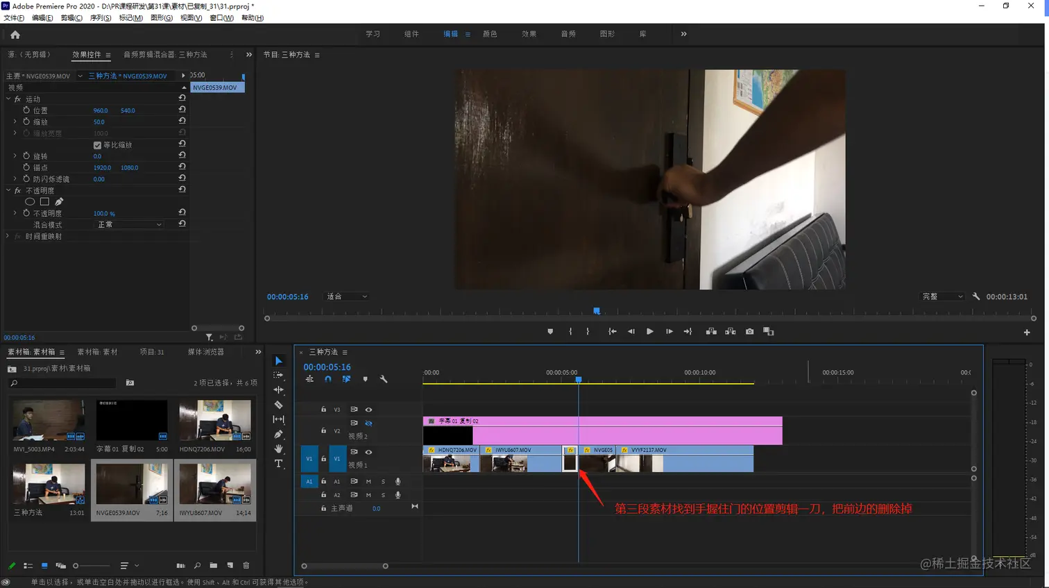 - 第三段素材找到手握住门把手的位置剪辑一刀,把前边剪辑掉的删除
