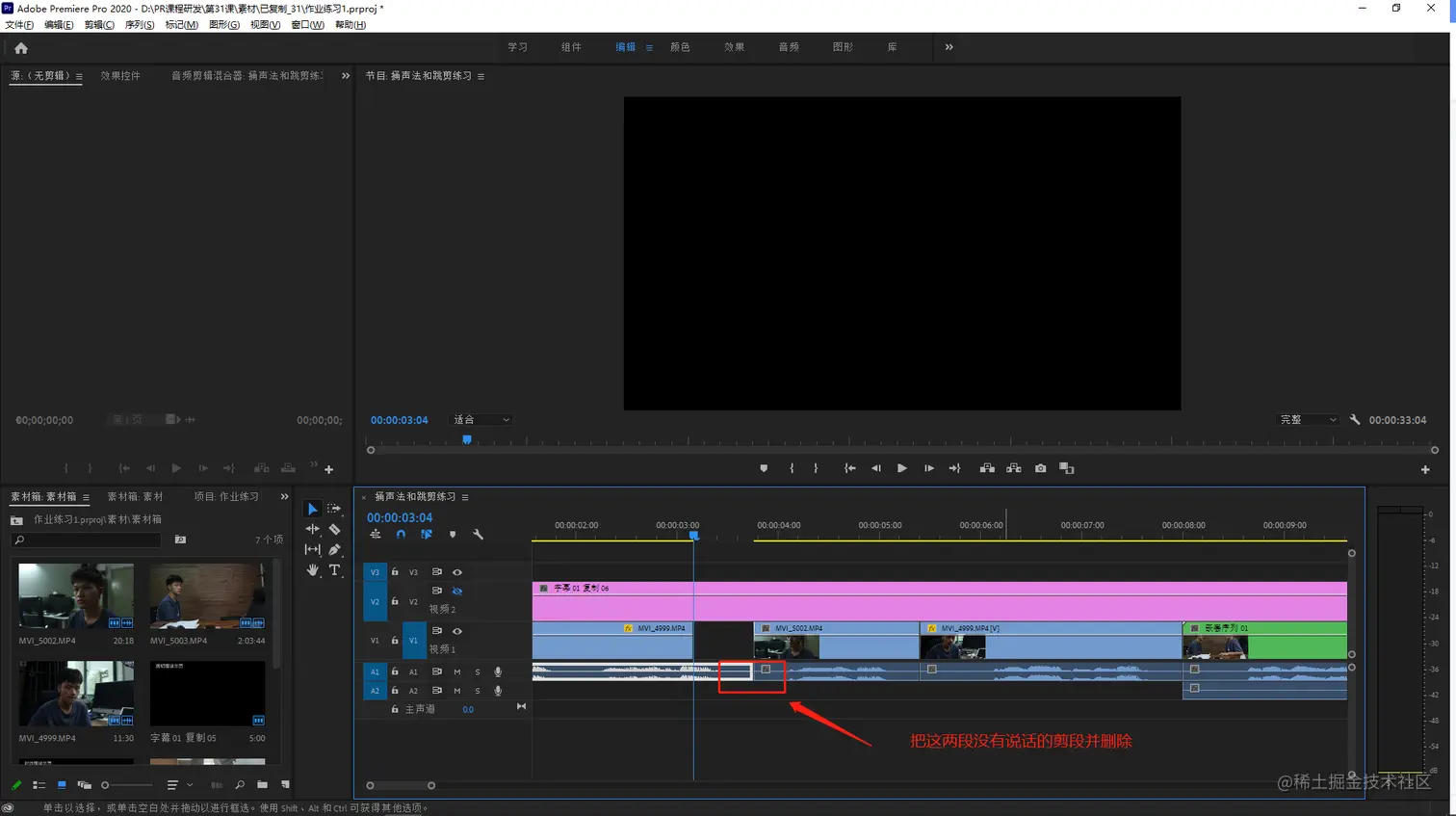 - 这时我们发现第一段素材,和第二段素材的音频,有一部分是没有说话的,把没有说话的剪掉