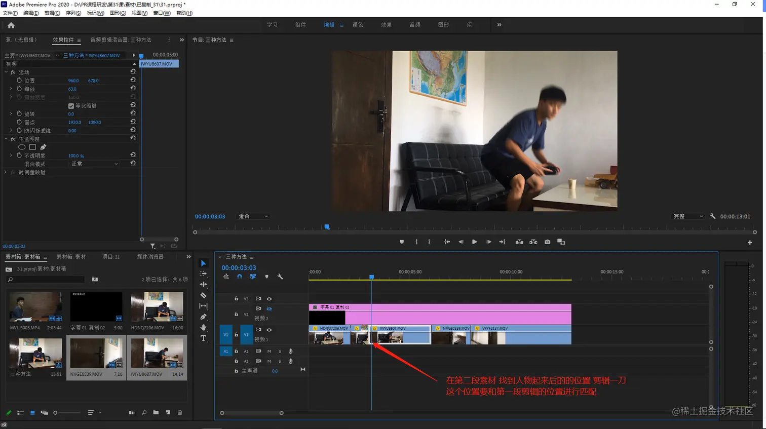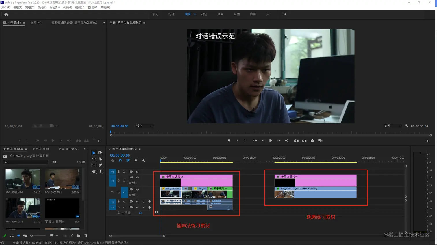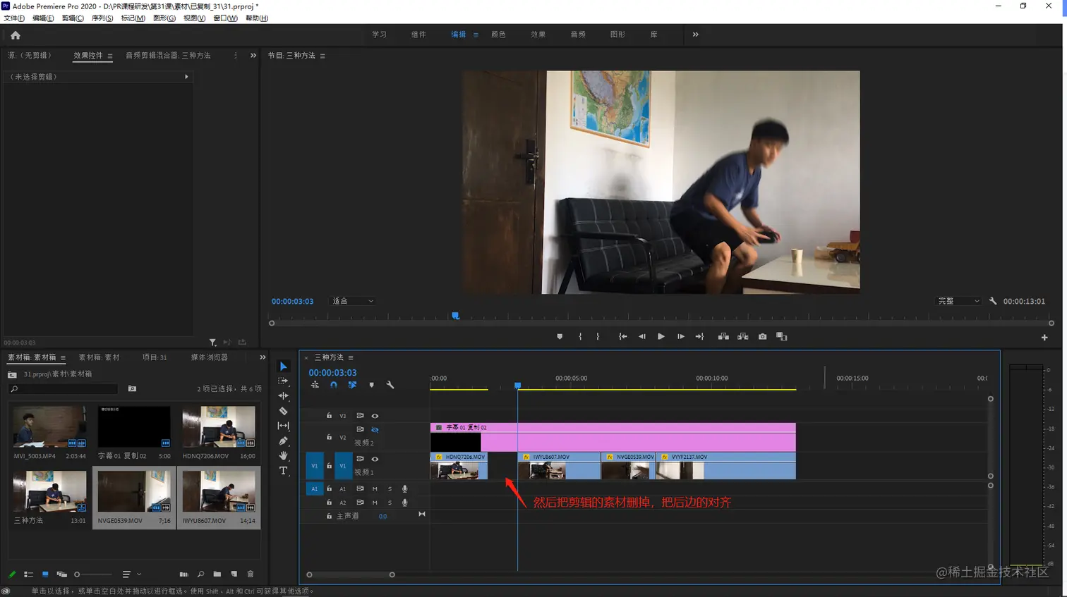- 时间线面板上有两部分视频,第一部分为捅声法素材,第二部分为跳剪素材