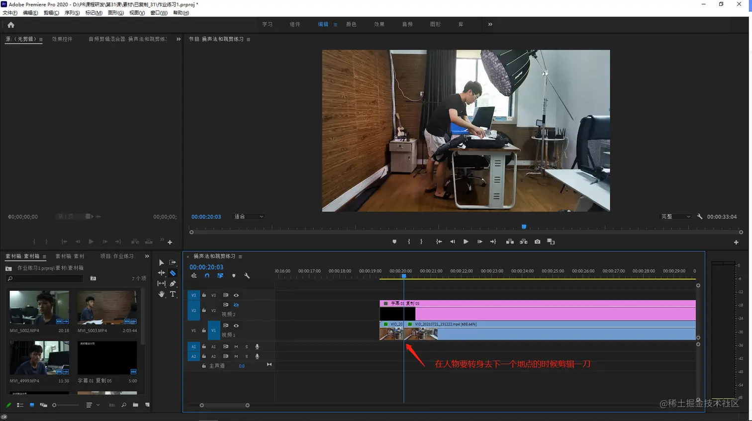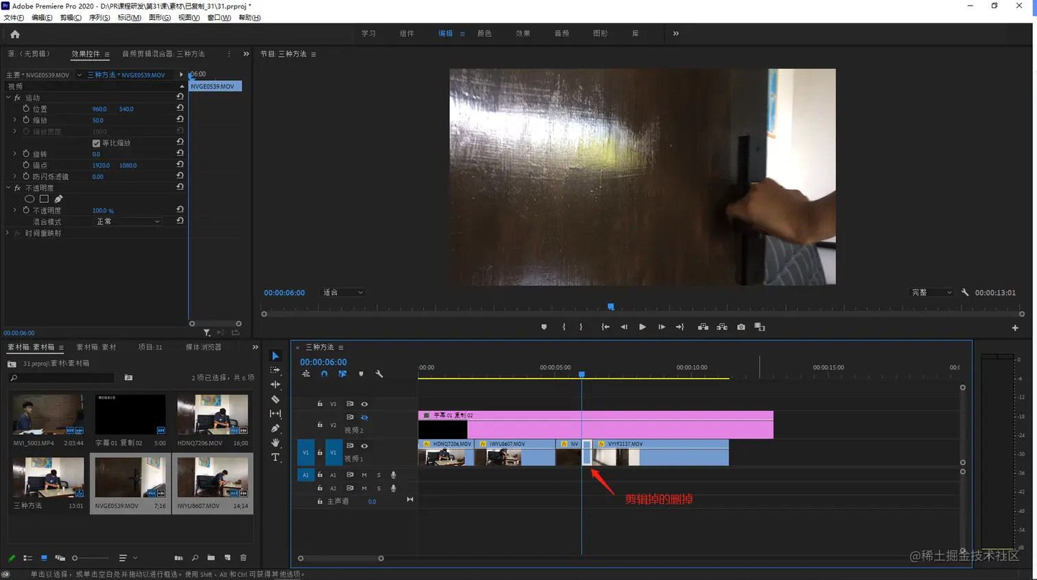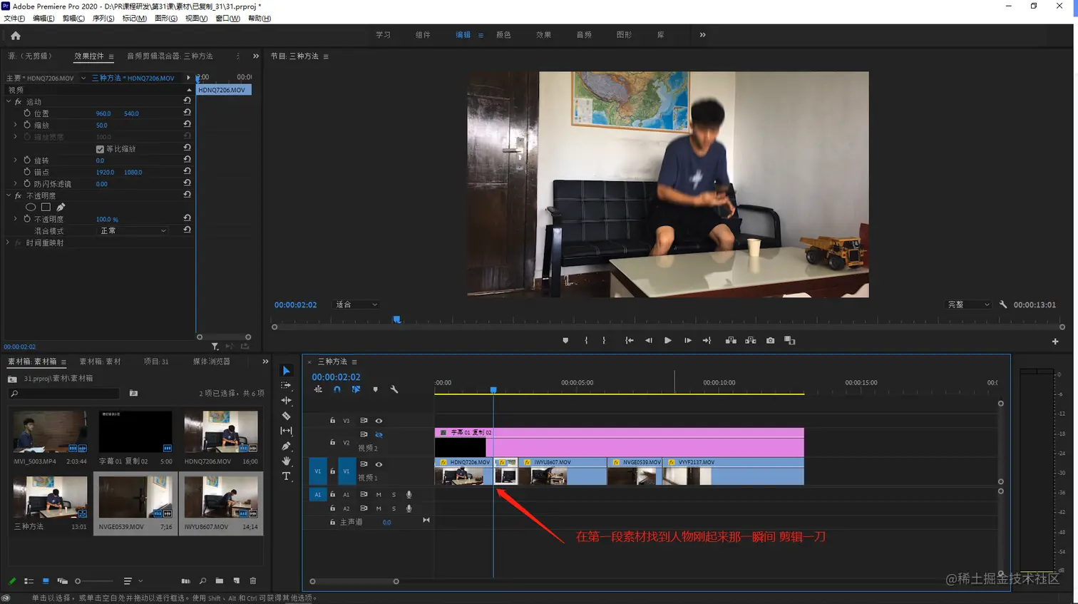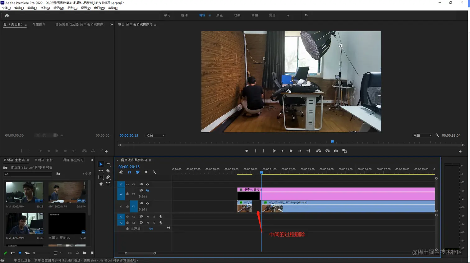 - 时间线面板上有两部分视频,第一部分为捅声法素材,第二部分为跳剪素材