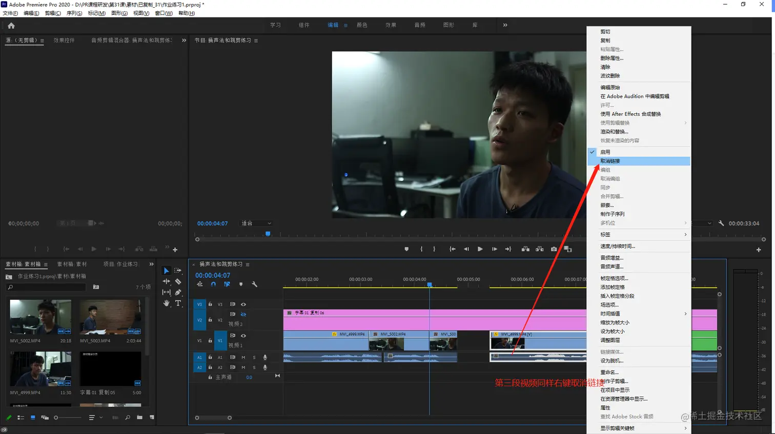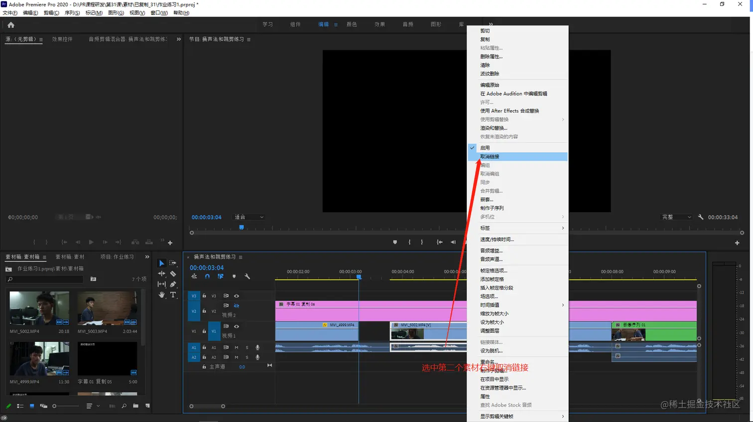 - 接下来我们处理第三段视频,同样右键取消链接,将视频和音频分离