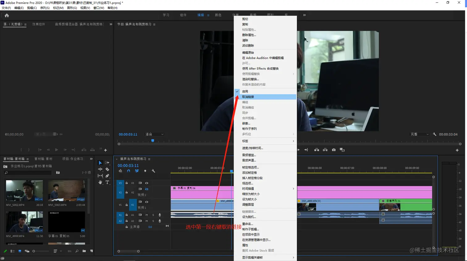 - 选择第一段视频,右键取消链接,将视频和音频分离