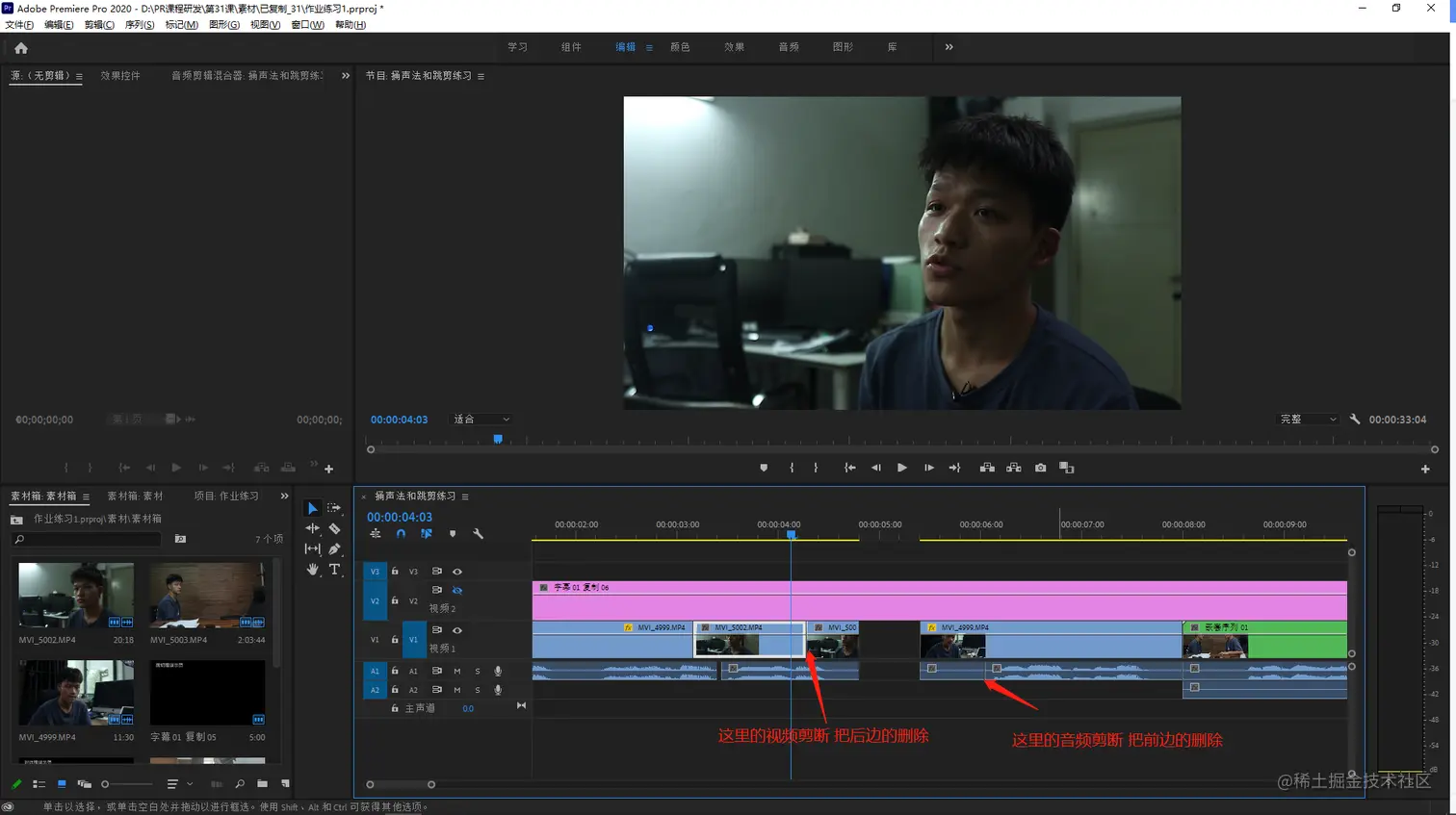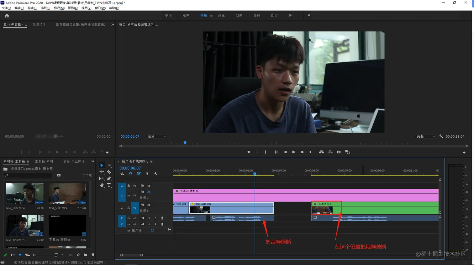- 把第三段后半部分音频剪断,把第四段前半部分视频剪断(要记得右键取消链接)