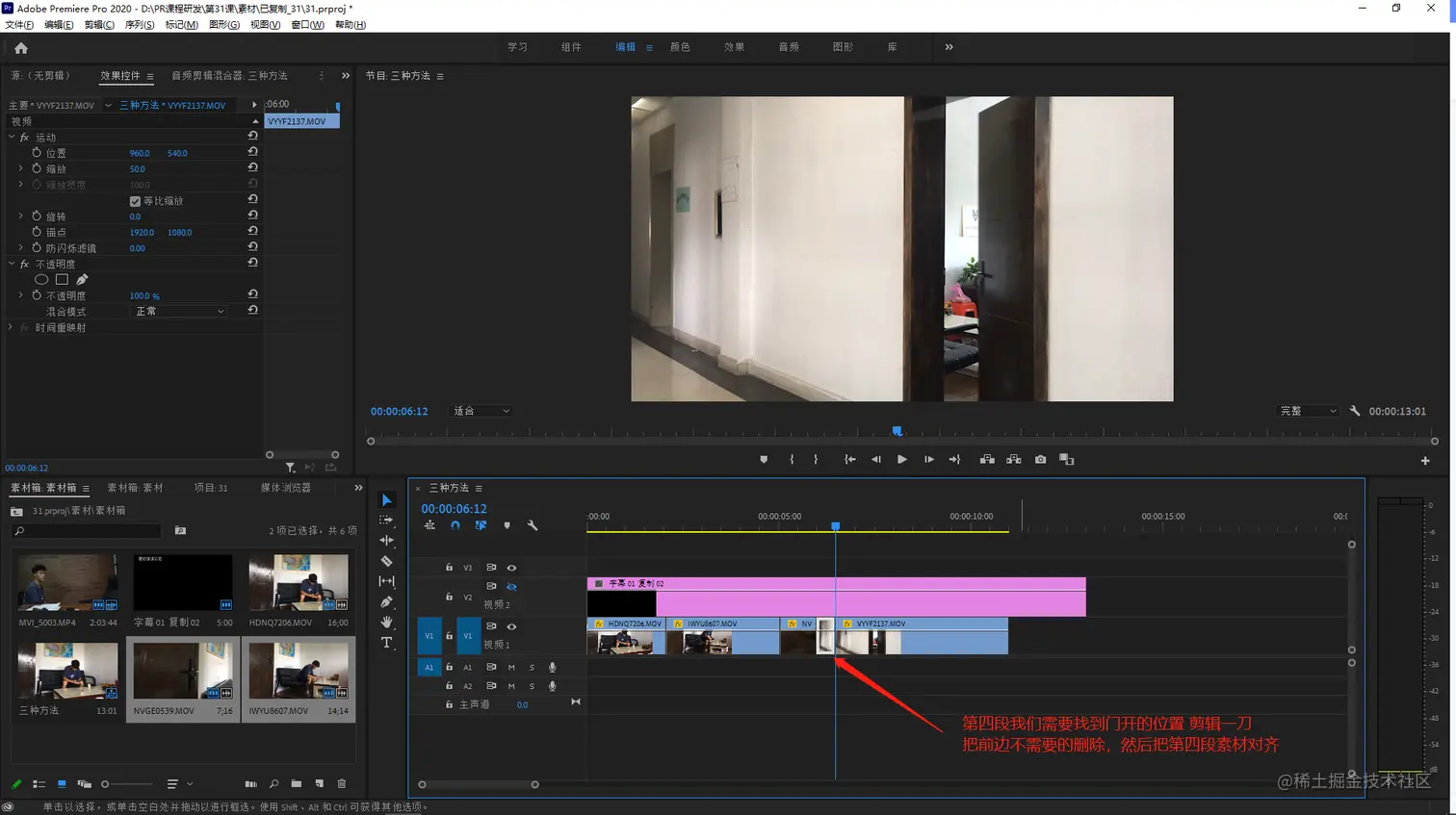 - 因为在上一个镜头们已经打开了,所以第4段需要找到们打开的位置,剪辑一刀,然后把前边的删除掉,然后把第4段和第3段对齐。