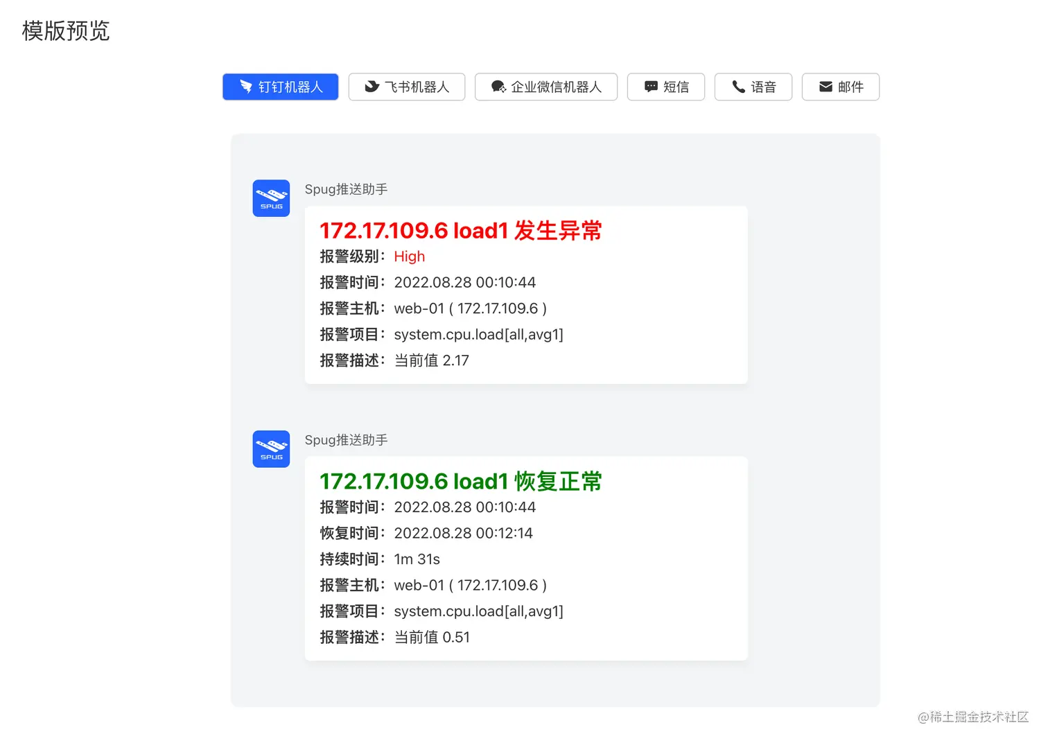 推送助手是一个集成了电话、短信、邮件、飞书、钉钉、微信、企业微信等多通道的消息推送平台。 用户只需要调用一个简单的URL,就可以完成多通道的消息推送。链接:push.spug.cc