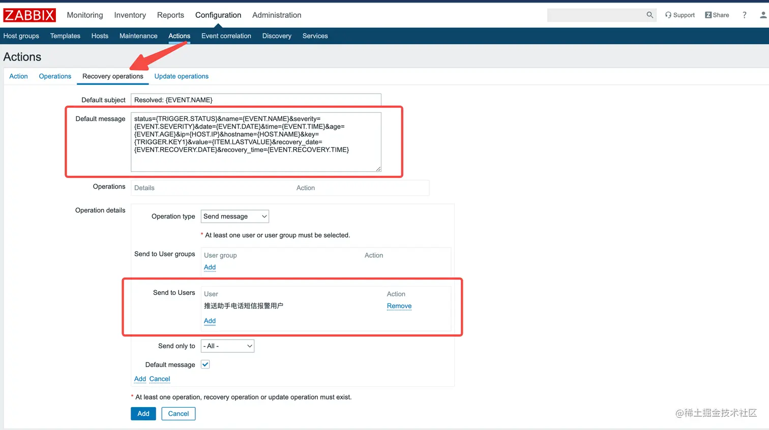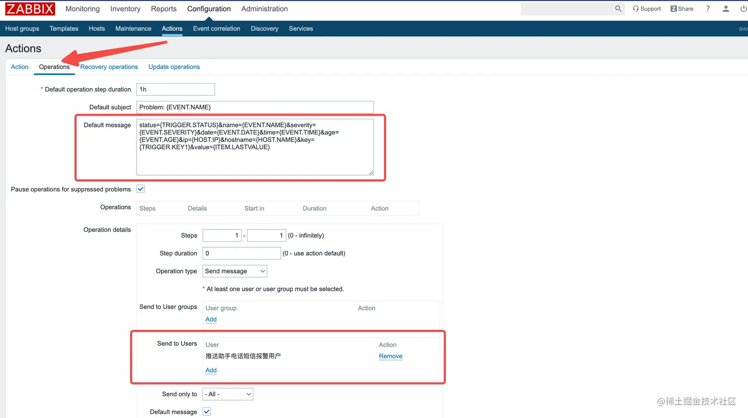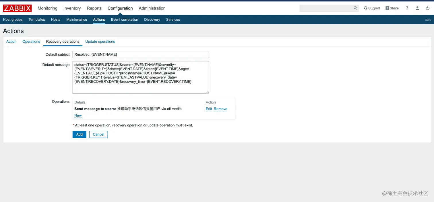 - Action / Operations / 复制添加下面的Operations-Default message默认消息内容