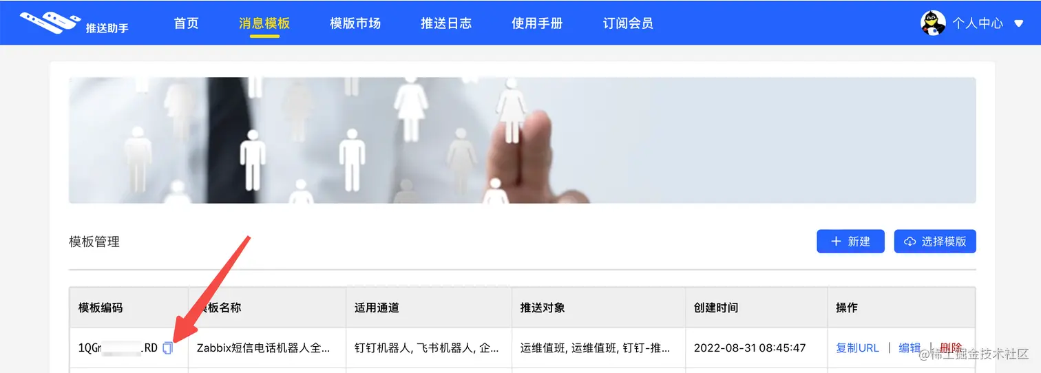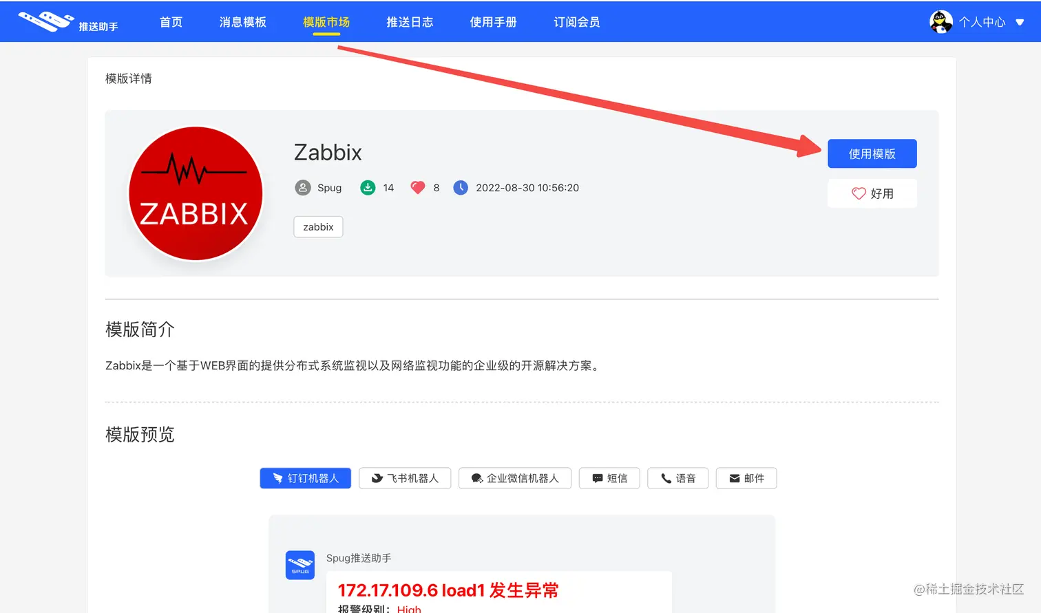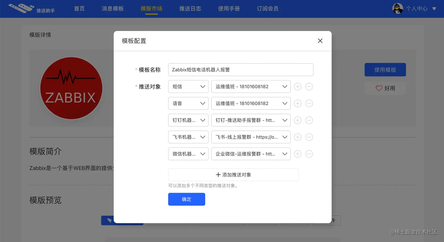 打开推送助手官网,选择Zabbix模板