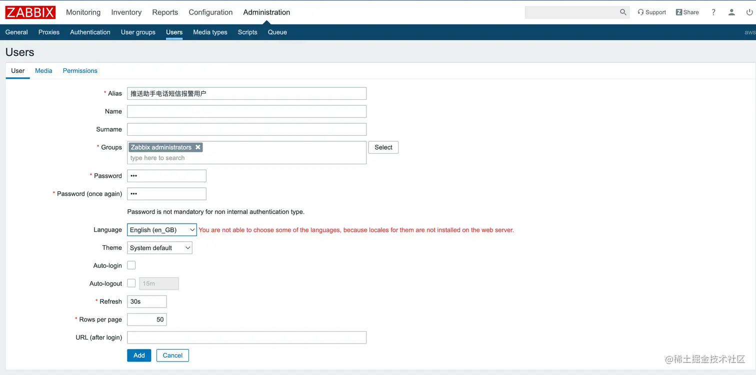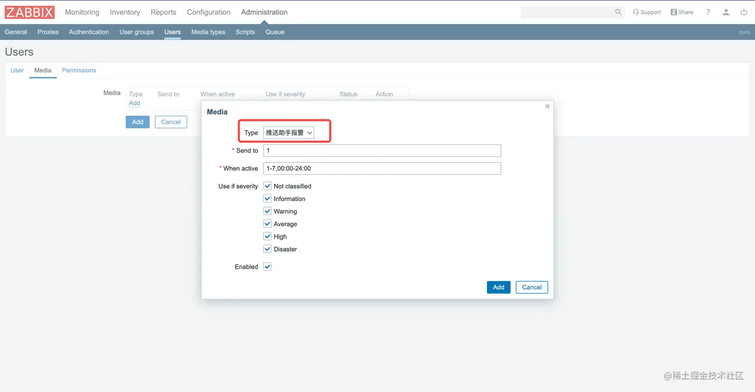 Zabbix / Administration / Users / create user / Media选择上面创建的[推送助手报警] / Add
