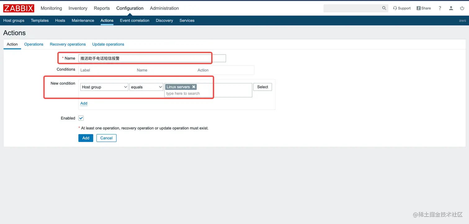 - Opeartions / New / operation detail / Send to User / 选择推送助手电话短信报警用户 / Add 保存