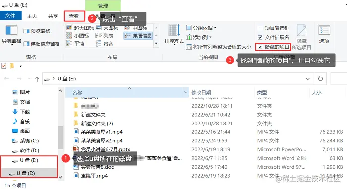 还有一种可能,你的u盘文件被隐藏了, 导致你找不到u盘数据(在电脑查看u盘属性,如果里面有数据被占用,你又找不到的情况)。u盘文件误删除如何恢复?打开电脑桌面的图标【此电脑】,选择u盘,在页面上方找到【查看】并点击它,选择【隐藏项目】来恢复隐藏的文件。