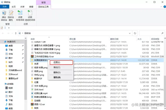 除了组合键的方法,还有什么方法吗?电脑u盘删除的文件如何恢复? 你也可以打开电脑【回收站】,找到不久前删除的u盘文件,选择好后,右键点击【还原】。