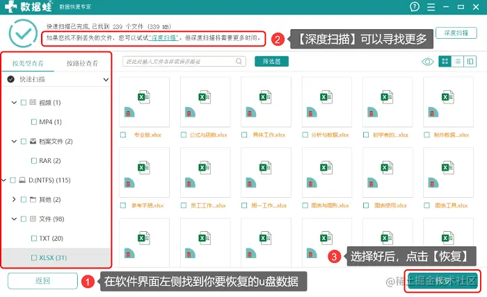 步骤2:扫描结束,在软件界面左侧找到你要恢复的u盘数据,并在文件名称的左侧方格进行勾选,确认无误后,就可以选择恢复文件。如果左侧没有你要恢复的u盘文件,就通过软件右上角的提示来进行【深度扫描】,虽然扫描时间会长点,但是用户反馈,这样扫描的数据会更全面。之后选择【恢复】即可。