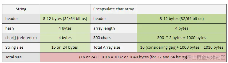 但是我们必须考虑到 Java String 类有不同的实现,但一般来说,主要大小由 char 数组保持。