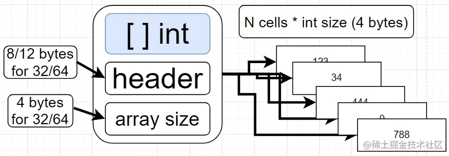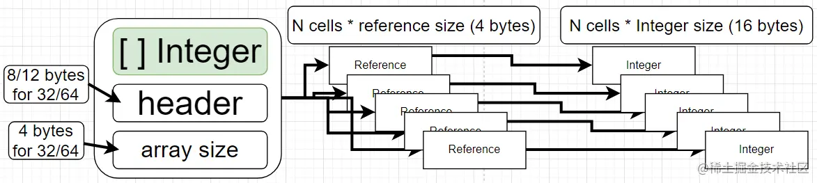 因此,您可以看到基元数组和对象数组之间的主要区别 — 带有引用的附加层。在这个例子中,大多数内存丢失的原因 - 使用一个整数包装器,它增加了12个额外的字节(是原始字节的3倍!