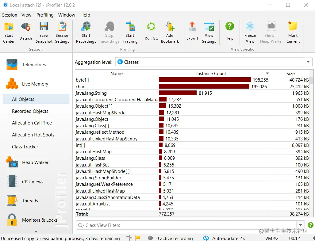 为了确认我们的计算,我们执行我们的代码并将JProfile附加到它。作为替代方案,您可以使用任何其他分析器,例如VisualVM(它是免费的)。如果您从未分析过您的应用程序,则可以查看本文。下面是 JProfiler 中配置文件屏幕的外观示例(这只是一个与我们的实现无关的示例)。