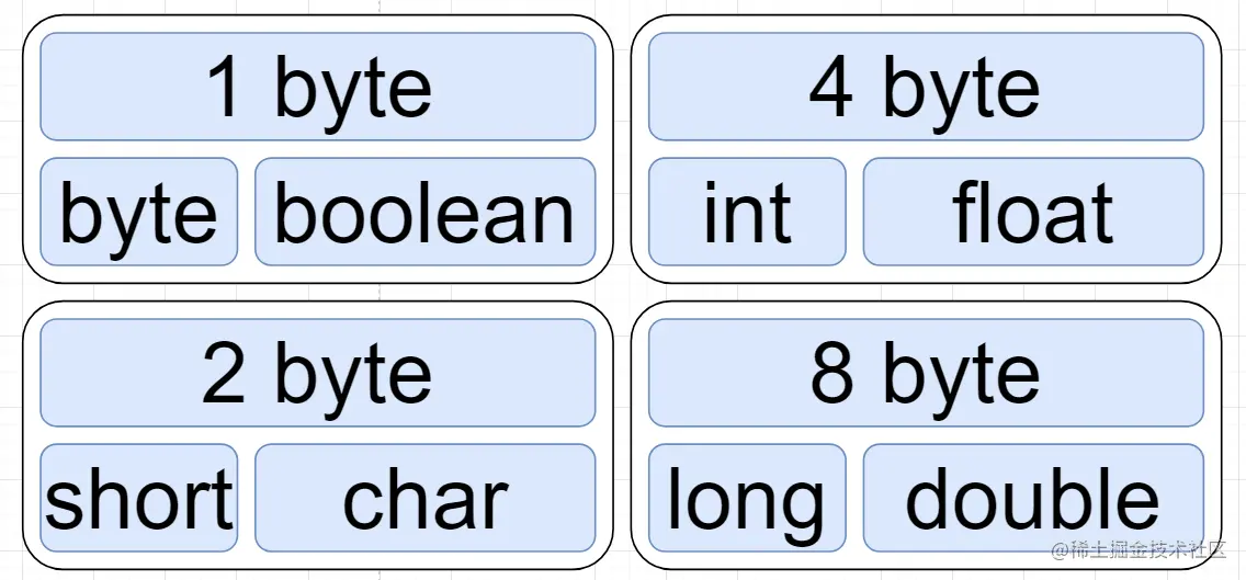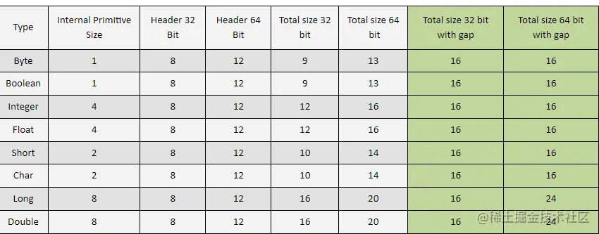 在Java中,除了原语和引用(最后一个是隐藏的)之外,所有内容都是对象。所以所有的包装类都只包装相应的基元类型。所以包装器大小一般=对象头对象+内部基元字段大小+内存间隙。下表显示了所有基元包装器的大小: