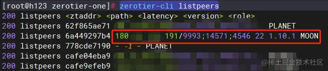 如果出现moon节点的IP地址,并且结尾显示MOON,则表示内网服务器客户端已加入moon。